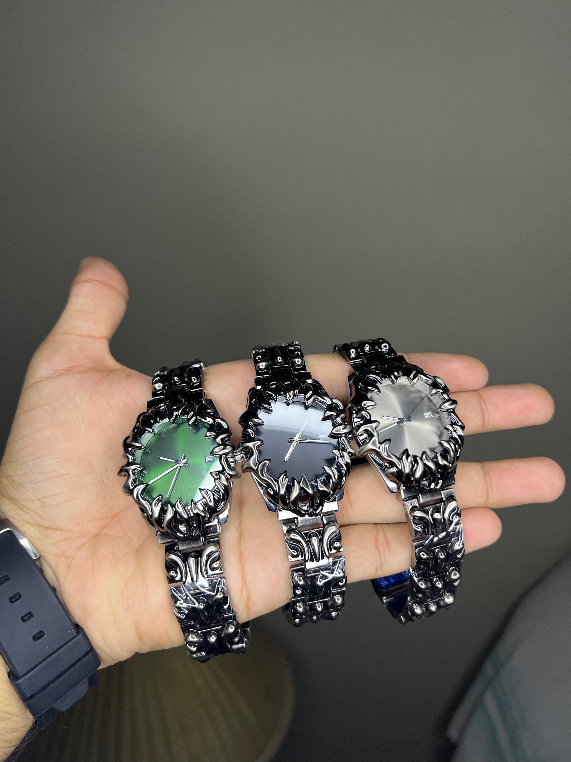 Dare to wear the darkness with the Alabaster Watch, a sinister fusion of gothic design and modern precision. Encased in matte black stainless steel, this timepiece is wrapped in a venomous crown of sculpted claws and twisted chain-link detailing. Its deep black sunburst dial radiates quiet menace, while sleek silver hands and a subtle date window keep you tethered to the present.